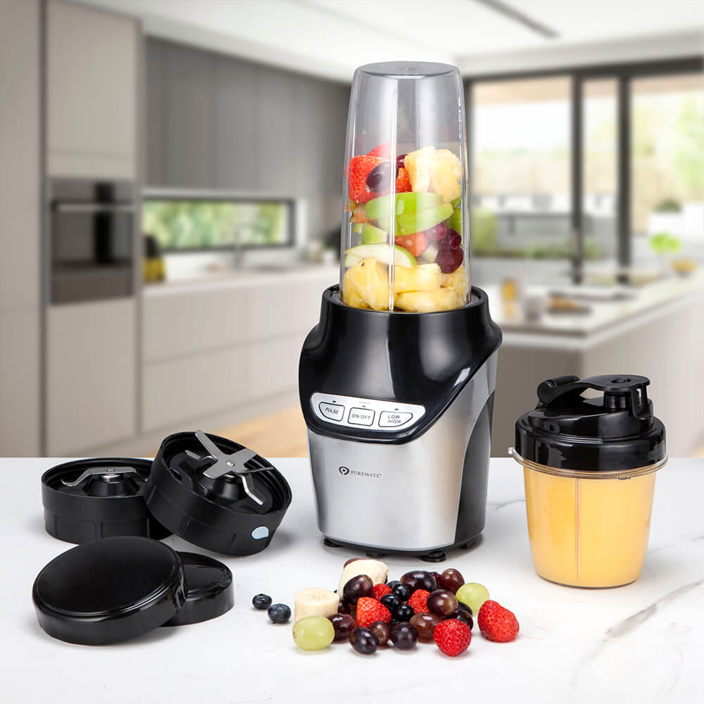 PureMate Smoothie Maker and Blender, 1000 Watts, 8 Piece Set, 3 Speed Settings, Stainless Steel Blades
