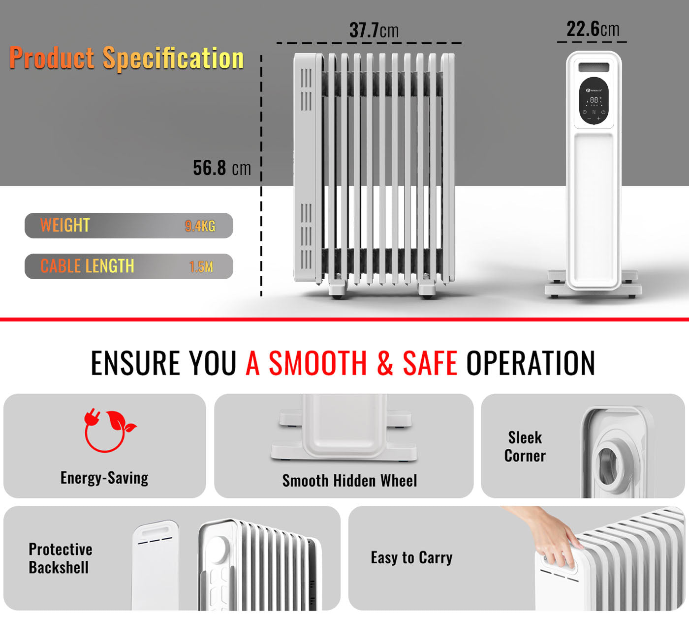 Safety and durability are built into every detail — featuring overheat protection, tip-over switch, and automatic shut-off for complete peace of mind. The sealed oil reservoir requires no refilling or maintenance, while the castor wheels and integrated carry handle ensure easy movement between rooms.