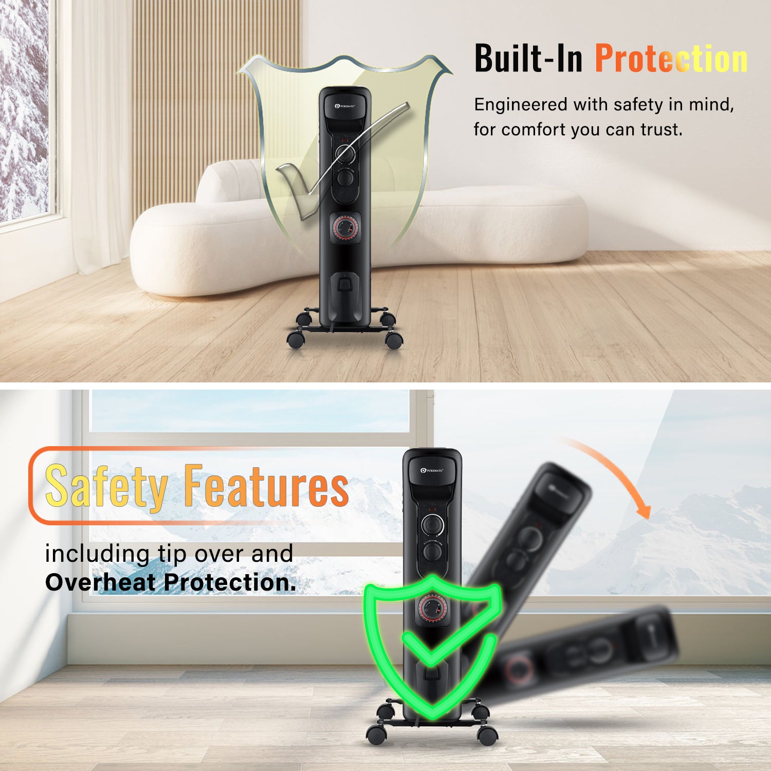 PureMate Oil Filled Radiator 2500W - 11 Fin - Portable Electric Heater, 3 Power Settings, Adjustable Temperature and Thermostat, Thermal Safety Cut off & 24 Hour Timer