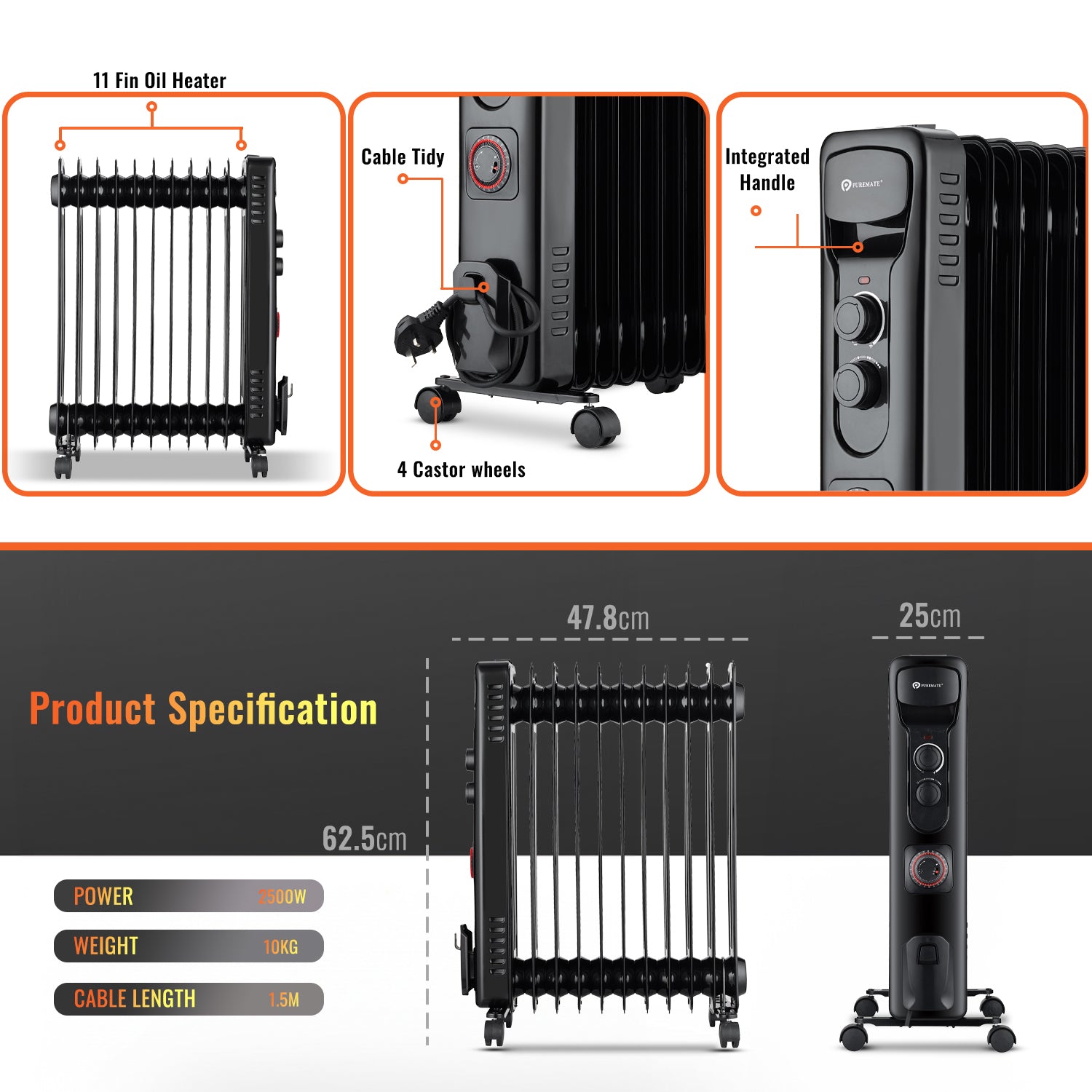This 2500W oil filled radiator from PureMate heats up rapidly and powerfully rooms of all shapes and sizes. Featuring 11 oil-filled fins, it is perfect for keeping your bedroom, living room, home or office warm. Oil-filled radiators are perfect for rooms that require heating over a continuous time period and offer an economical heat resolution compared to the running of a standard fan heater.