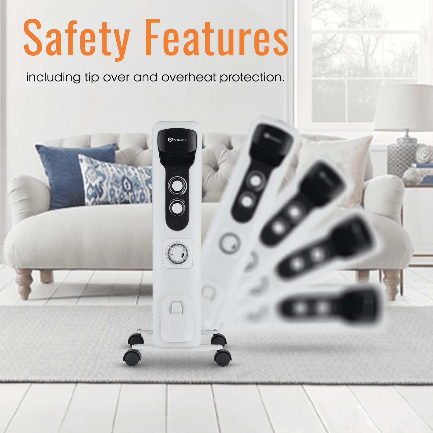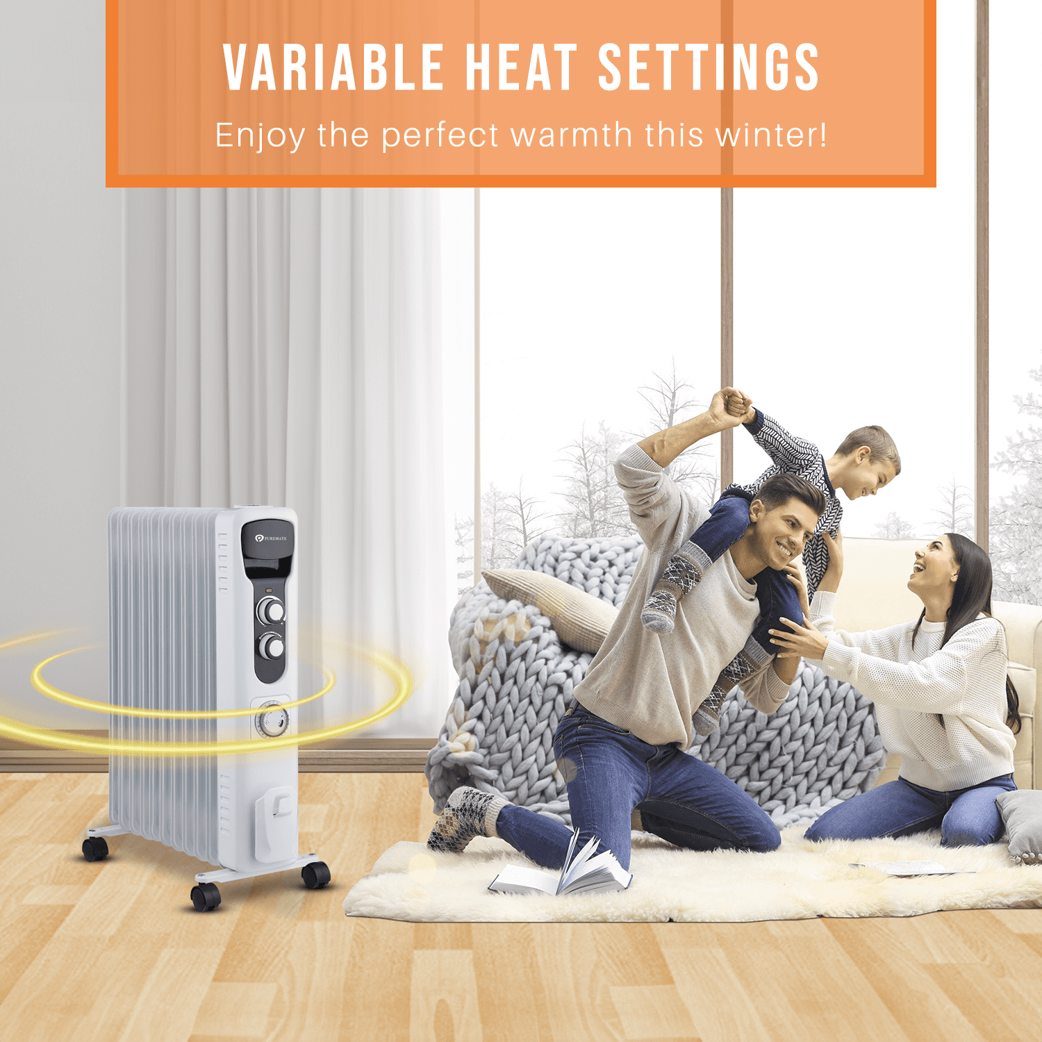PureMate Oil Filled Radiator 2500W - 11 Fin - Portable Electric Heater, 3 Power Settings, Adjustable Temperature and Thermostat, Thermal Safety Cut off & 24 Hour Timer