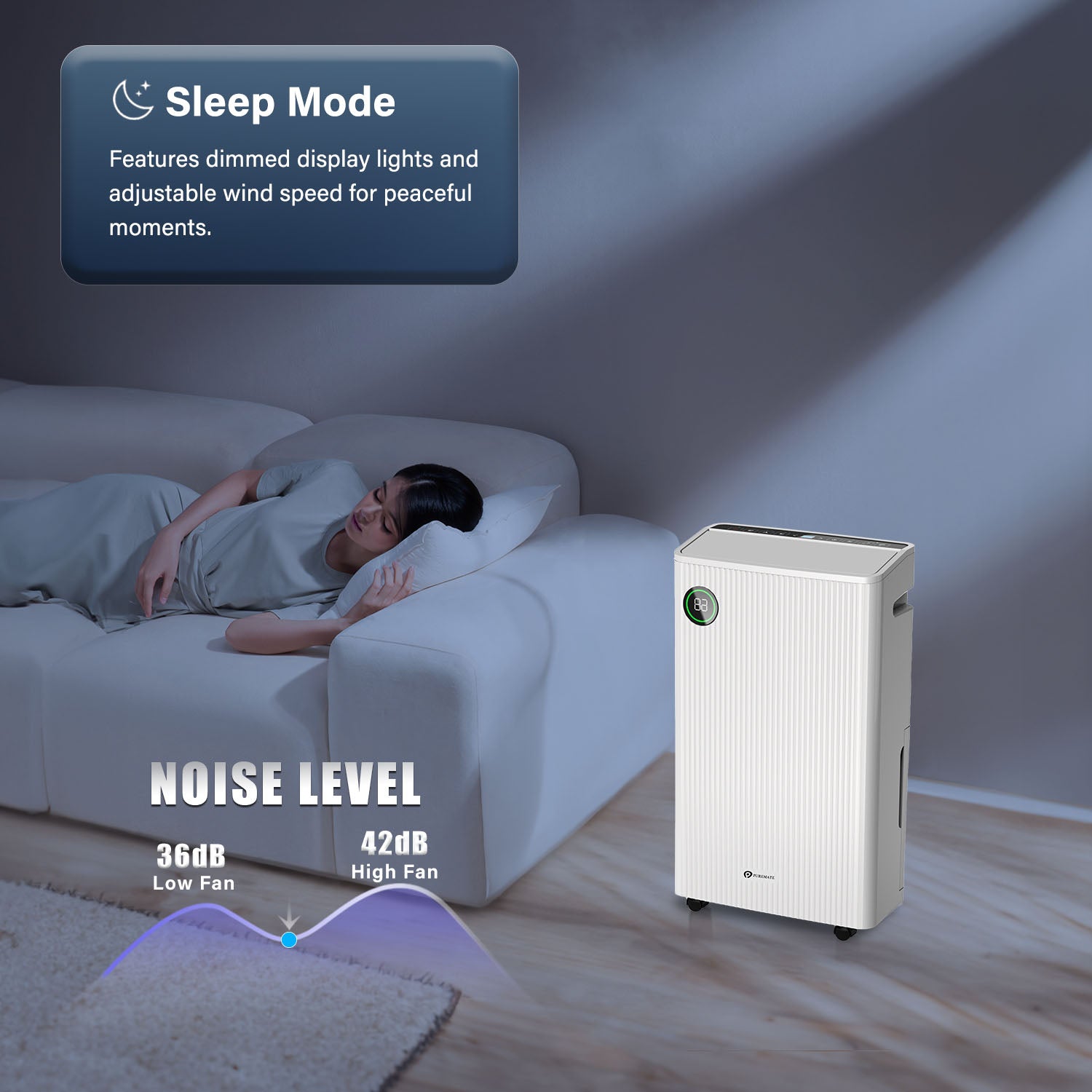 With an LED display and 3-light humidity indicator system, stay informed about the humidity levels in your home. The lights display a quick snapshot of current conditions: Blue for low (<50%), Green for optimal (50-70%), and Red for high (>70%) humidity levels, enabling you to adjust settings accordingly.