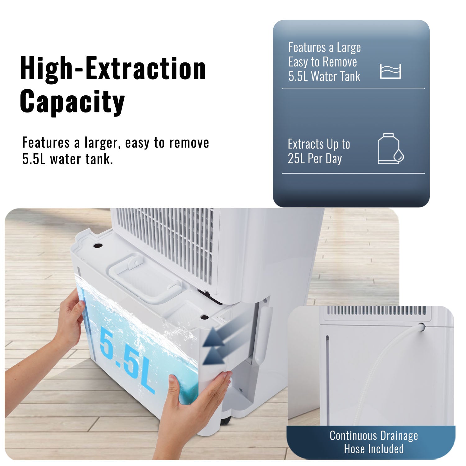 25L Dehumidifier with 5.5 Litre Tank Capacity, Digital Display, Continuous Drainage, Laundry Drying