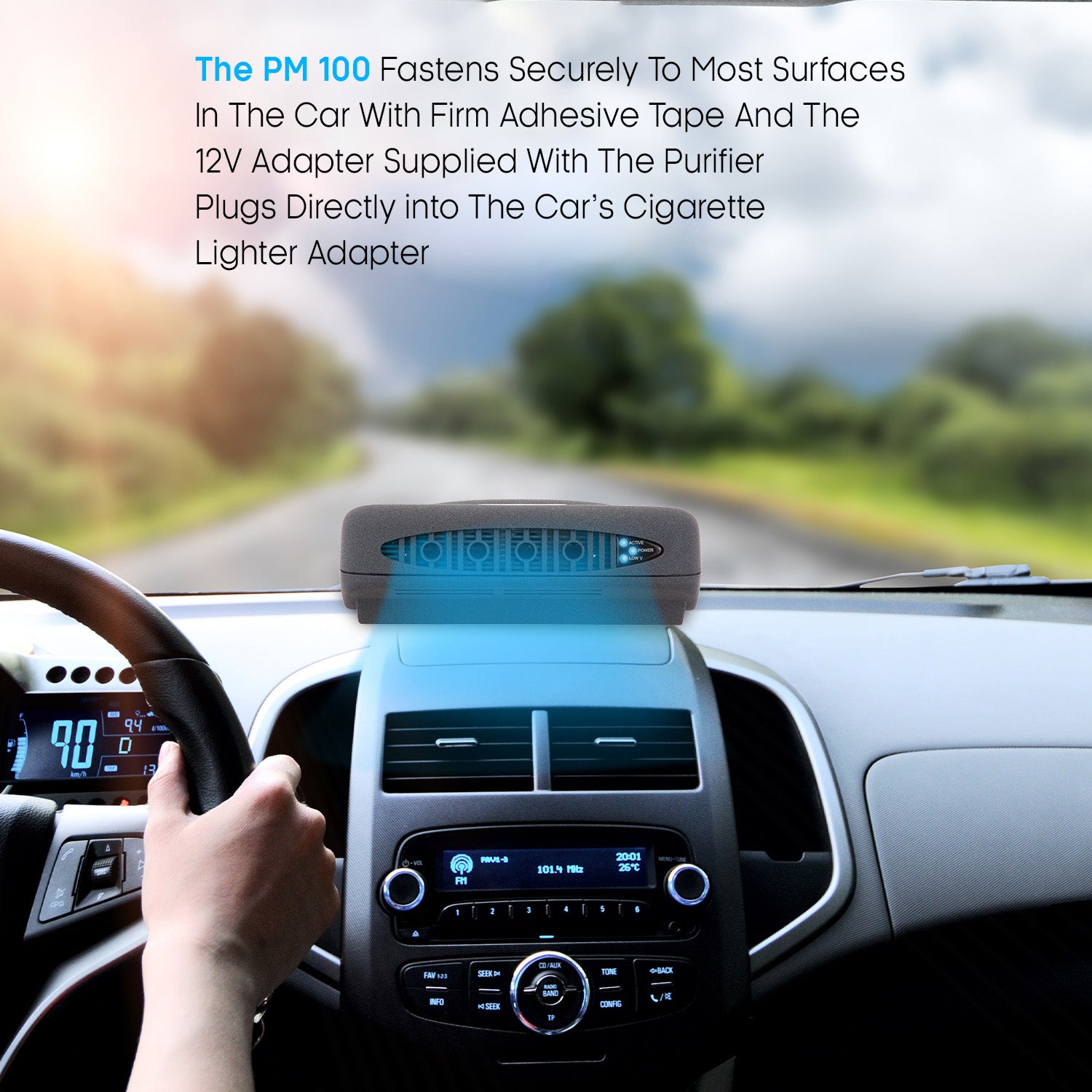 - Easy Installation: The PM100 can be easily mounted securely to most surfaces in a car using firm adhesive tape. It comes with a 12V adapter that plugs directly into the car’s cigarette lighter adapter for convenient use on the go.