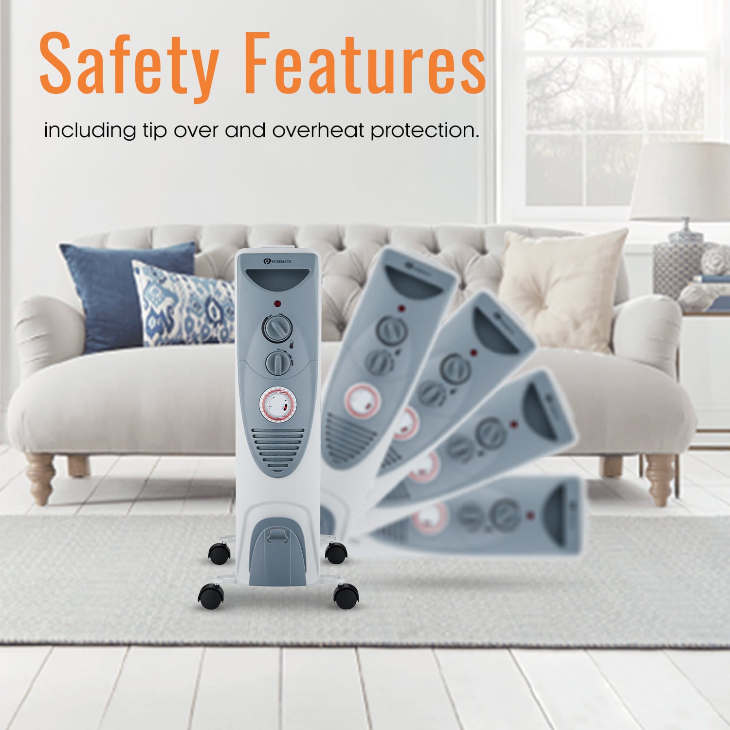 - Safety is very important to us here at PureMate, this is why our oil filled radiator has the following safety features incorporated into it's design; overheating protection, auto-thermo shut off and auto tip-over switch.