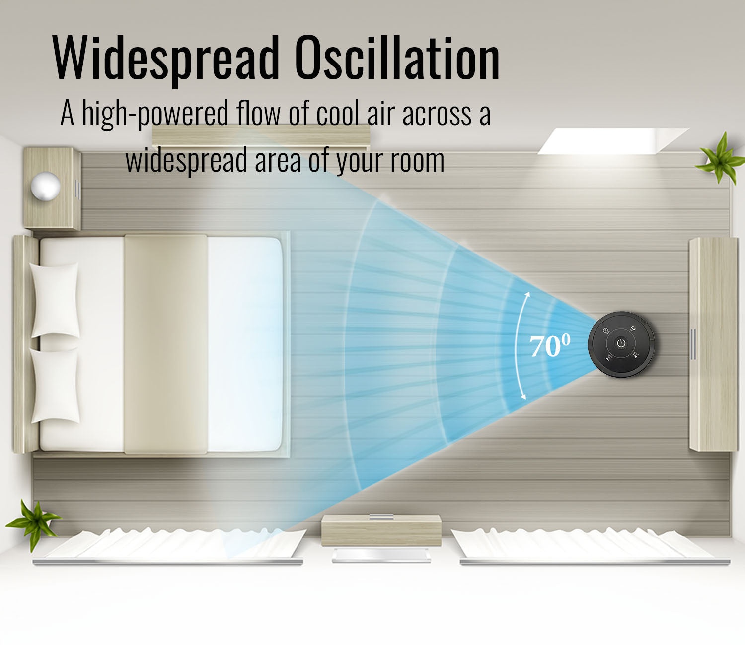 - 70° Oscillation: Automatic 70-degree rotation for widespread and even air distribution.