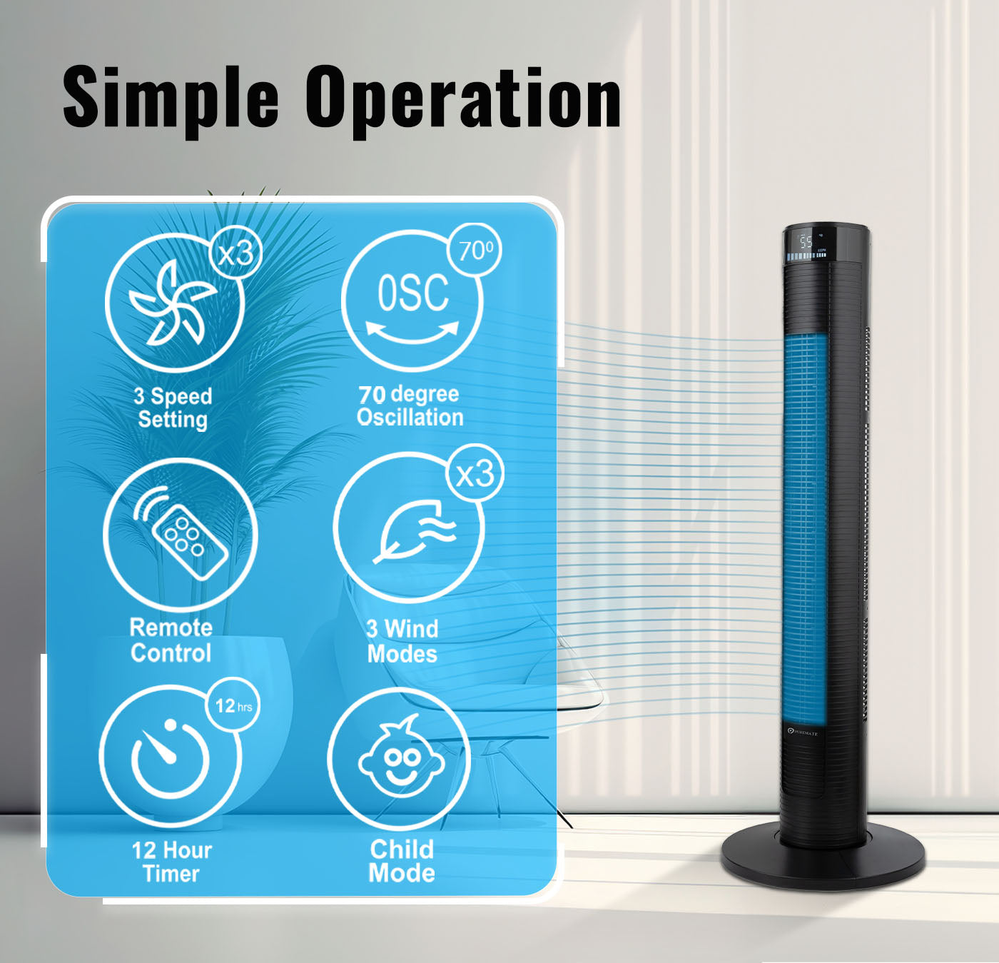- Customizable Comfort: Various speed settings, wind modes, oscillation, and a 12-hour timer ensure personalized comfort.