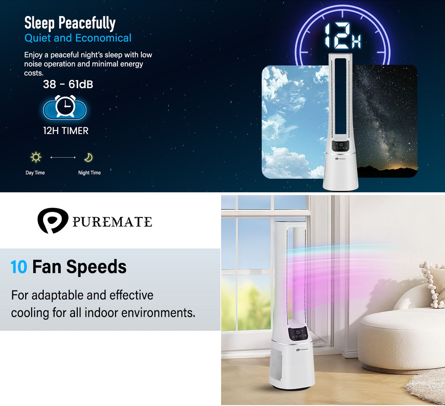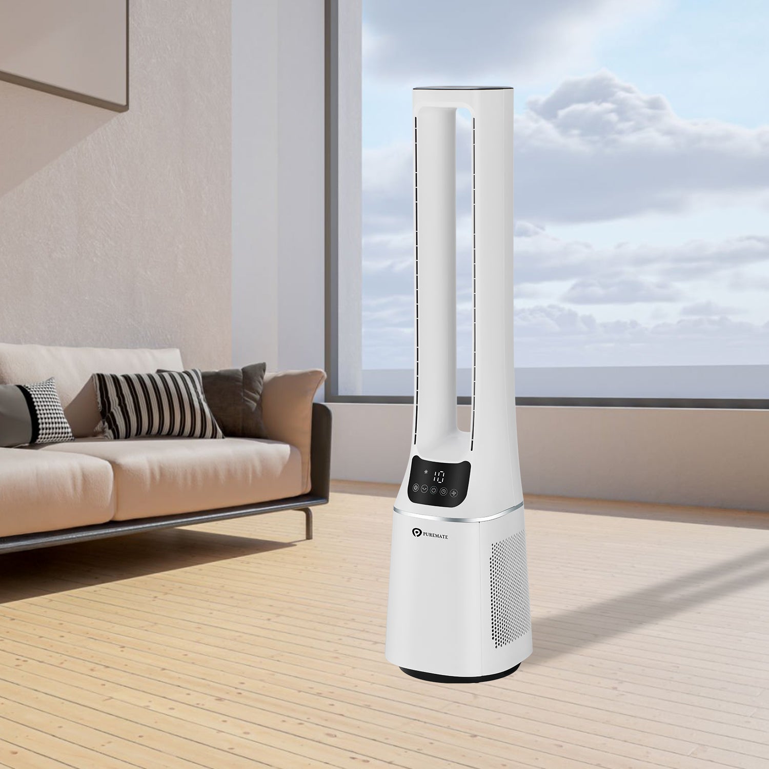 Stay cool, breathe easy, and enjoy a smarter way to refresh your space with the PureMate 42-Inch Bladeless Tower Fan with Air Purifier.